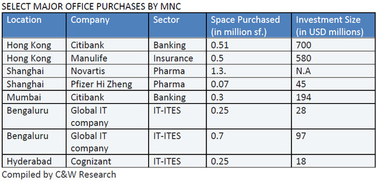 According to Cushman & Wakefield, multinational companies (MNC) are increasingly investing in purchasing offices in India and China. MNCs in the Banking, Financial Services, Information Technology, Consumer Goods and Pharmaceutical sectors are among the lead commercial office buyers in these markets.