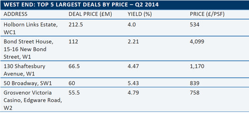The top five deals for Q2 2014 in the City & Docklands accounted for £1.72 billion, or 70% of total investment.