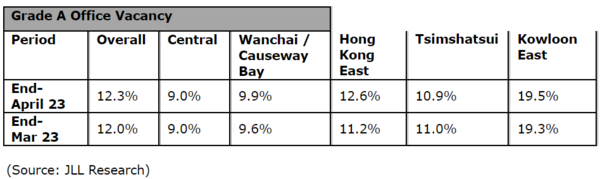 The overall office market recorded a negative net absorption of 245,100 sq ft in April, due to the return of some sizable spaces to the market during the month. The overall vacancy rate rose marginally to 12.3% at the end of April, with Central's vacancy rate remaining flat.