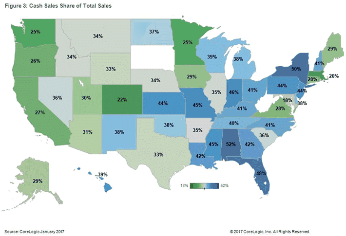 According to CoreLogic, cash sales accounted for 36.5 percent of total U.S. home sales in January 2017, unchanged from January 2016. The cash sales share peaked in January 2011 when cash transactions accounted for 46.6 percent of total home sales nationally. Prior to the housing crisis, the cash sales share of total home sales averaged approximately 25 percent.