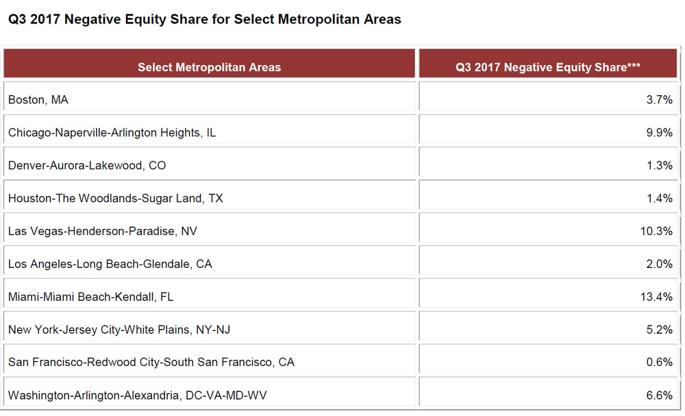 On a quarter-over-quarter basis, from Q2 2017 to Q3 2017, the total number of mortgaged homes in negative equity decreased 9 percent to 2.5 million homes, or 4.9 percent of all mortgaged properties. Year over year, negative equity decreased 22 percent from 3.2 million homes, or 6.3 percent of all mortgaged properties, from Q3 2016 to Q3 2017.