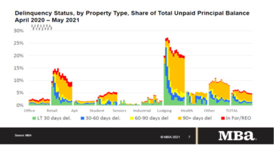 According to the Mortgage Bankers Association, delinquency rates for mortgages backed by commercial and multifamily properties continue to decline in May 2021.