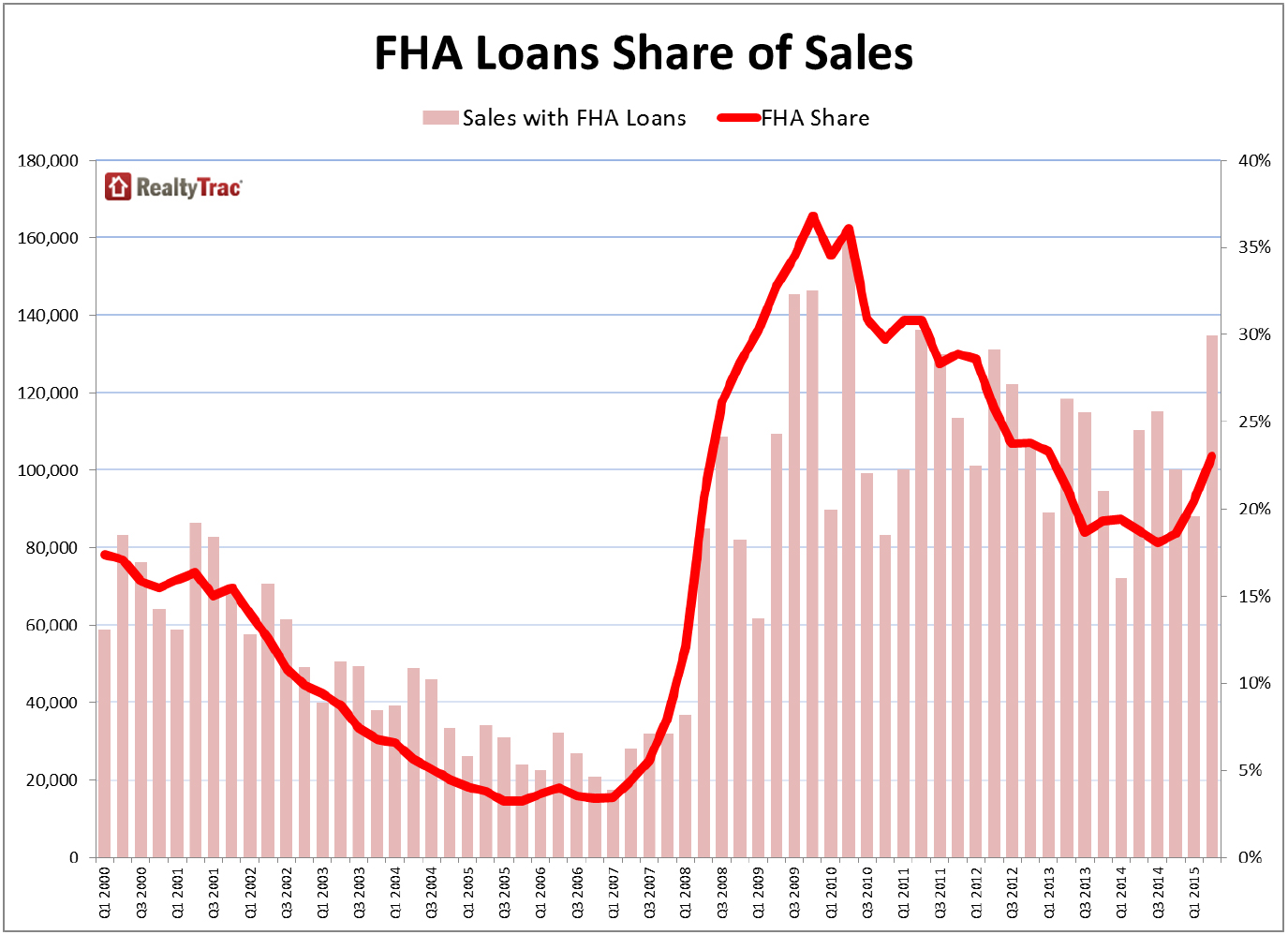 Buyers using Federal Housing Administration (FHA) loans -- typically low down payment loans utilized by first time homebuyers and other buyers without equity to bring to the closing table -- accounted for 23 percent of all single family home and condo sales with financing -- excluding all-cash sales -- in the second quarter of 2015, up from 20 percent in the first quarter and up from 19 percent in the second quarter of 2014 to the highest share since the first quarter of 2013.